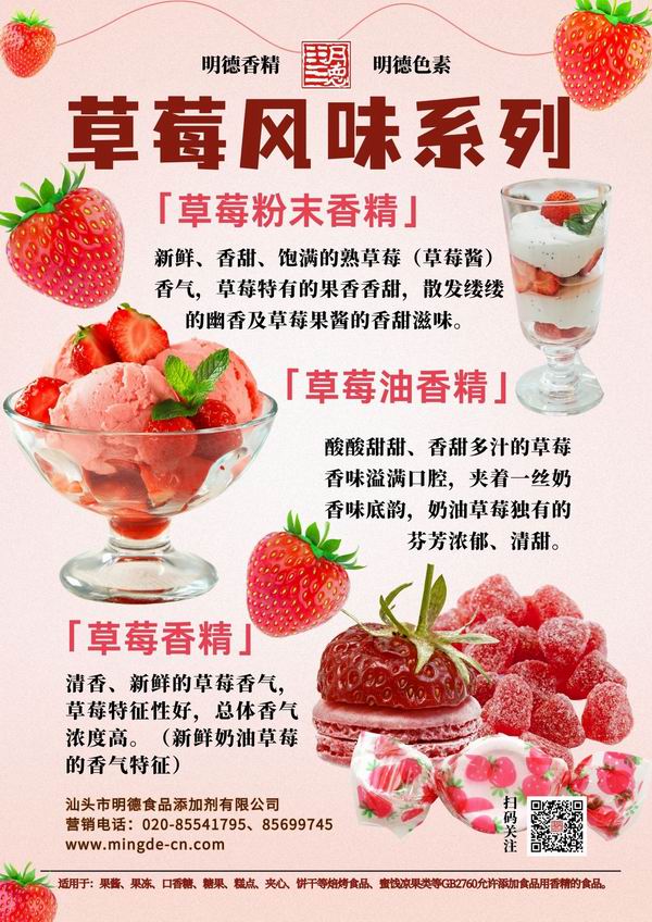 在草莓香精領(lǐng)域我們數(shù)十年潛心專研,迎合市場(chǎng)需求,滿足消費(fèi)者喜好,汕頭市明德食品添加劑有限公司,推出了多種風(fēng)味的草莓香精,如:草莓醬風(fēng)味、奶油草莓風(fēng)味、新鮮草莓風(fēng)味、熟草莓風(fēng)味等。