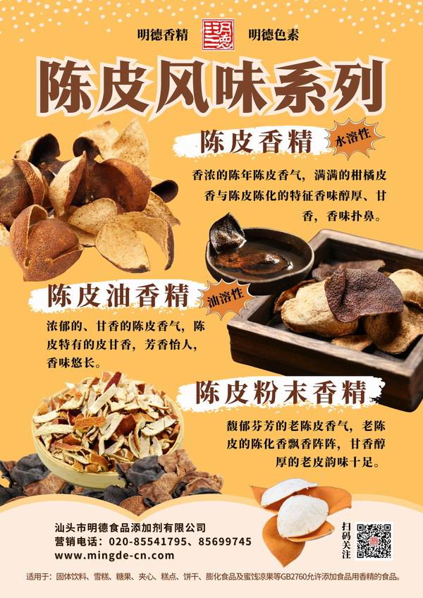 明德 陳皮風(fēng)味香精選擇眾多,有老陳皮風(fēng)味、橘皮風(fēng)味、九制陳皮風(fēng)味、陳皮梅風(fēng)味等等,任君選擇。